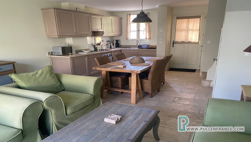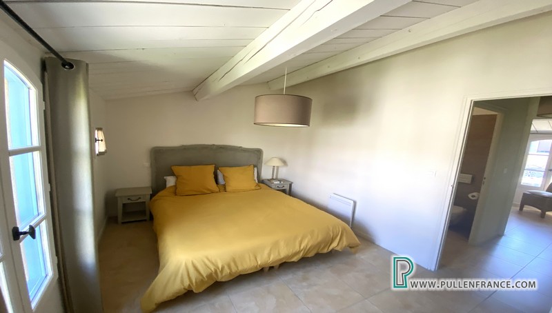 This well constructed property is designed and furnished in a contemporary ‘Provencale’ style, using natural materials such as chalk paints, travertine flooring and wooden shutters. On the ground floor, one enters onto an open plan living room with a fully fitted kitchen, dining room and guest WC at one end and a salon at the other. Triple patio doors at this end open onto an attractive terrace/garden bounded by hedges and Mediterranean shrubs. A solid stone staircase leads to the upper floor, where a small hallway opens onto 2 bedrooms, both with built-in wardrobes, and a bathroom with a window bringing in natural light.